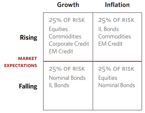 “”Bonds will perform best during times of disinflationary recession, stocks will perform best during periods of … growth, and cash will be the most attractive when money is tight.” Translation: all asset classes have environmental biases. They do well in certain environments and poorly in others. As a result, owning the traditional, equity heavy portfolio is akin to taking a huge bet on stocks and, at a more fundamental