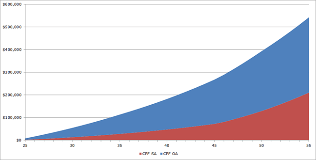 From the chart above, CPF SA alone is approximately $210,000 at the age of 55. So the CPF OA which is $332,000 will be required as well for the Minimum Sum. Depending on how the user uses the CPF OA, for example to buy a house, would there be a short fall?