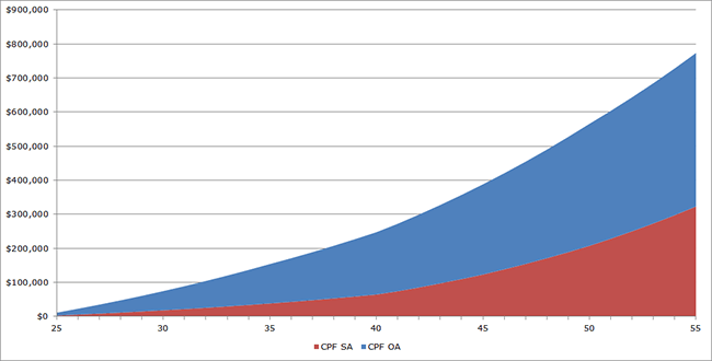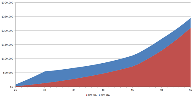 From the chart, based on CPF SA alone, the individual is able to accumulate approximately $322,000 which is $56k short of the $376,000. However, the CPF OA has almost $451,000 in the account, so even if the individual uses portion of the OA to pay for housing, achieving the Minimum Sum should not be a problem.