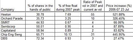 You can see that the blue chips can hardly reach 1% of free float during the last phase of bull run, which supposedly is a period of highest demand. The penny stocks generally have lower float and you can see that the % of the free float increase several folds during 2007.