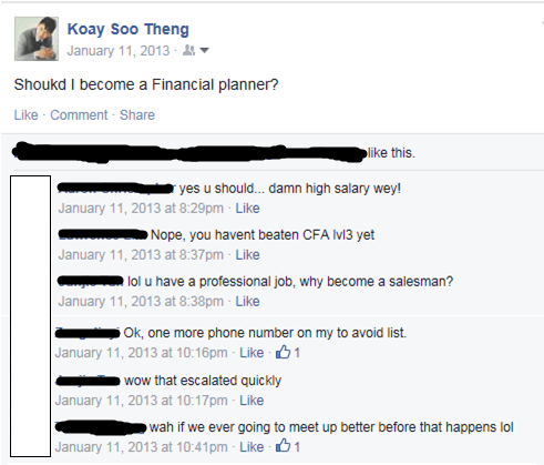 Interestingly, I first thought of being a financial advisor some years ago. I shared my thought on facebook and received many comments from my friends. None of them were flattering. One of my friends said – you have a professional job, why you want to become a salesman? Another said – one more phone number to be avoided.