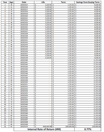 - The IRR result is derived from a $300,000 coverage for a 30 year old male. Different coverage and different ages will yield different results.
