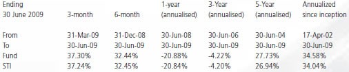 That can’t be right – 34.58% pa means the STI should be astronomical on 30th June 2009! On the fund’s inception April 2002, STI closed at 1,725.37. On 30th June 2009 as stated in the report, it closed at 2.333.14.