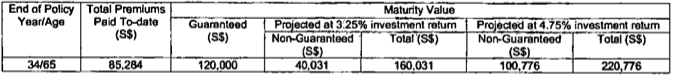 The guaranteed return is $120,000 which means regardless of market condition, this amount is promised to you by the insurance company at maturity if you do not die prematurely. In addition, there is a non-guaranteed component of $40,031.