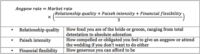 Forget about the mind-boggling plethora of websites and online forums dedicated to the latest wedding angpow rates. Here comes PARF – a Personal Angpow Rate Formula – to help you calculate just how big an angpow you should give at weddings.